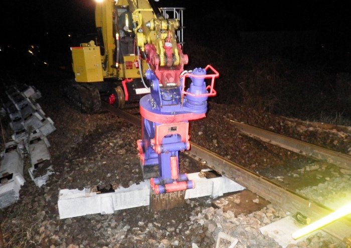 輸送量の少ないローカル線では旧来の木まくらぎによる区間が多く残存していますが、安全面や乗り心地の向上、また将来的なメンテナンス省力化を目的として、強度や耐久面で優位なPCまくらぎへの交換を進めています。 当社では当初より軌陸バックホウを用いた機械施工を行い、施工方法のさらなる改良を図ることで、今では一晩あたり80~100本の交換を実現しています。平成20年頃より毎年約5万本の交換を施工しており、地方交通の安定輸送の確保に貢献しています。