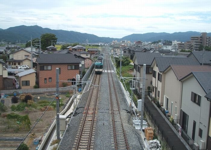 工事は既存の単線に平行してバラスト軌道や直結軌道による新しい線路を新設していくもので、あわせて新設スペースを生み出すための軌道移設や分岐器撤去を多数伴う工事でした。また、施工区間は嵯峨嵐山をはじめとする観光名所の多い路線であり、太秦駅周辺の施工では東映太秦映画村の撮影時に作業を一時中断する等の対応が必要となりました。