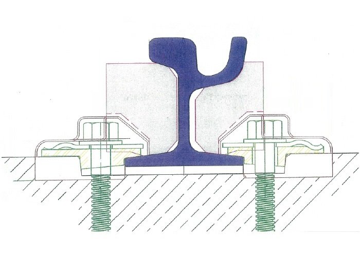本工事では、海外(特にヨーロッパ)では主流となっている「溝型レール」が採用され、また同時にPCまくらぎ化等の軌道強化を行う工事であったため、基地にて仮組みした軌道を写真のようにトレーラーで運搬しクレーンにより吊上げ、敷設を行いました。