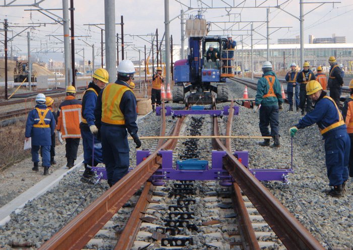 摩耗や損傷、経年使用により劣化したロングレールの交換について、当社全体で毎年100kmを超える延長を施工しており、レールの折損事故等の防止に寄与することで、日々の安全な列車運行を支えています。 当社では以前からロングレール交換機を活用した機械施工に取り組んでおり、近年ではその実績をもとに自社にて改良した新型機を導入し、機械施工の拡大と省力化、更なる安全施工を追究しています。