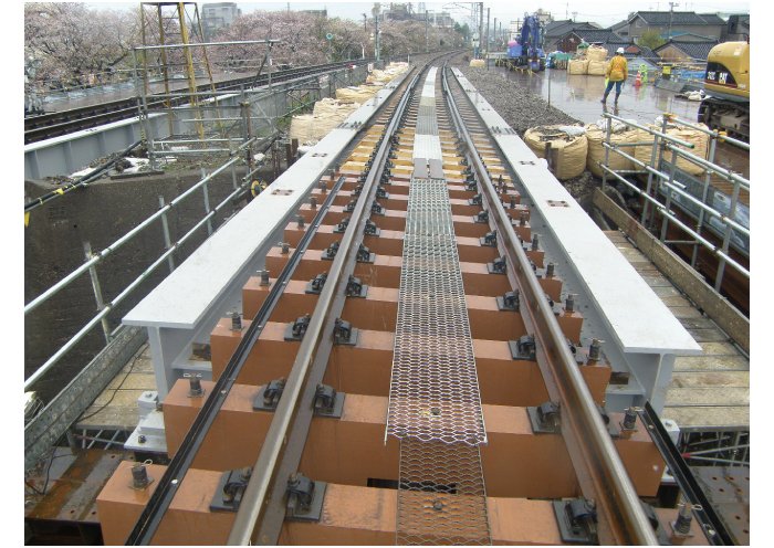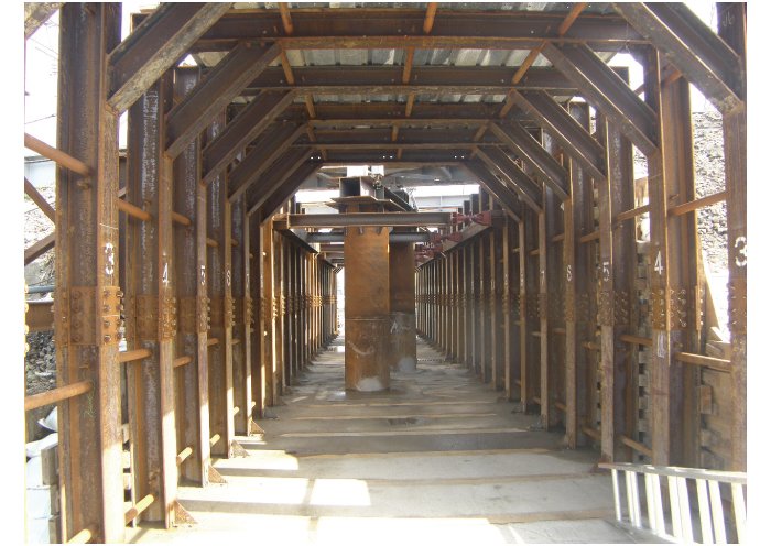 本工事は富山県が計画する主要地方道新湊庄川線の拡幅事業に伴う、道路改修工事です。工事桁と呼ばれる線路仮受桁を設置した後、メッセル工法にて線路下横断掘削を行い、鋼管杭を打設し、線路荷重を仮受けながら、躯体ボックスカルバートの構築を行いました。 線路下工事のため、特に列車への影響に細心の注意を払い施工しました。また工程管理も非常に厳しい現場でありましたが、無事故で完成しました。