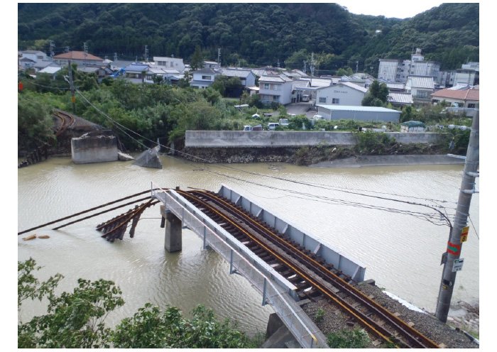 平成23年9月、台風12号の集中豪雨により紀勢線の各地で大きな災害が発生し、なかでも那智・紀伊天満駅間の那智川橋梁においては橋桁2連・橋脚1基が流出しました。当社の線路部門と土木部門が連携して仮設橋梁による仮復旧工事を不眠不休で行い、同年12月3日に運転再開を果たし、短期間での復旧に大きく貢献しました。その後、本設橋梁の新設と軌道の敷設、踏切の新設等の本復旧工事を進め、平成26年12月14日に線路切換を完了させました。