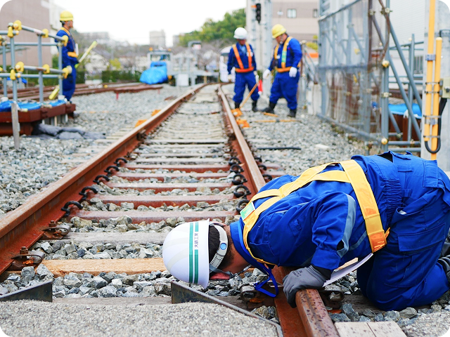 現在の仕事内容は?線路メンテナンス工事の施工管理業務補佐先輩について線路メンテナンス工事の施工管理業務補佐をおこなっています。朝の点呼から始まり、所長からの周知事項や昼夜作業、事務所にある無線機などの機械の台数確認をします。工事で使用する材料の準備や鉄道沿線にある住宅への工事広報チラシの配布、工事計画書の整理など業務は多岐にわたります。それらを終えた後は自分が補佐として従事する工事の内容を監督の先輩に聞き、工事に備えています。