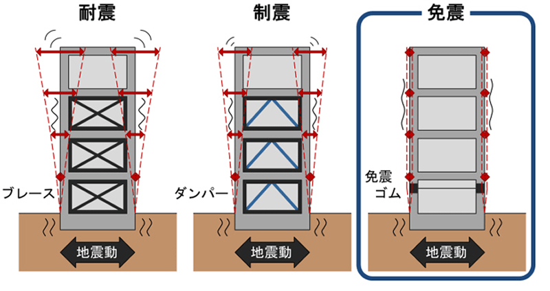 耐震改修工法には、耐震、制震、免震の工法があります。大鉄免震レトロフィット工法は、自社開発の仮受け方法を特徴とする、既存建物を免震化する耐震改修工法です。施工中も建物のほとんどの部分を使用したままで、改修後には地震の揺れによる建物への影響が最も少ない免震建物へと改修することができます。