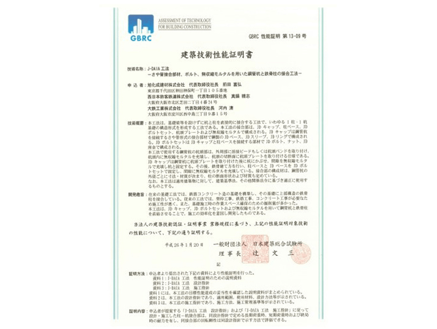 『J-DAIA工法』は、国土交通大臣の指定性能評価機関である一般財団法人日本建築総合試験所の建築技術性能認証委員会の審査に合格し、平成26年1月20日「建築技術性能証明書」を受領しました。併せて3件の特許の出願と商標の登録も行いました。 本性能証明を取得したことによって、『J-DAIA工法』を建築基準法、その他関係法令に基づき適用することが可能となりました。