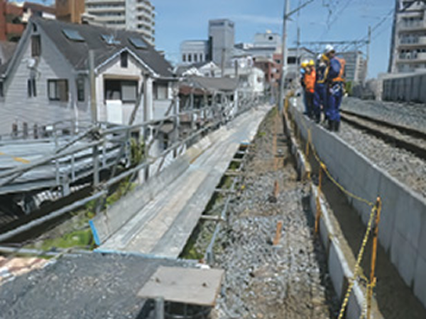 『軽量プレキャストC型ホーム柵基礎工法』は、超高強度繊維補強コンクリート製のC型プレキャスト基礎ブロックと小径鋼管杭を用いた盛土式ホーム柵基礎工法です。軽量のプレキャスト基礎ブロックを用いることでホーム上等で揚重、設置が可能であり、人力で施工可能な小径鋼管杭とで簡易に施工できます。プレキャスト基礎ブロックは、エレベータに積載可能な重量であり、ホーム上を人力で運搬することができます。プレキャストボックス内に電力ケーブル等に配置でき、効果的に設計支持力を得ることができる合理的な基礎構造になっています。従来工法より生産性に優れ、工期及びコストが削減可能です。