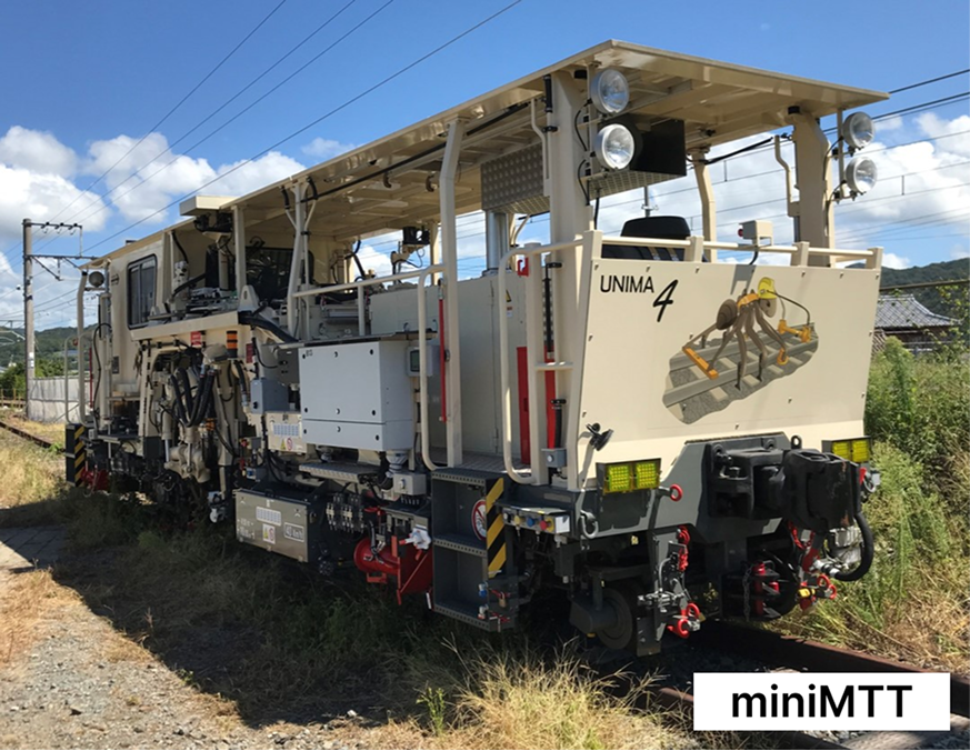 軌道上の走行が可能な工事専用の車両は総称して「保守用車」と呼ばれていますが、軌道作業を行う上では、この保守用車の使用が欠かせません。当社では、日本に数台しかない小型のマルチプルタイタンパ(miniMTT)を用いて軌道のゆがみを解消する作業を行っております。