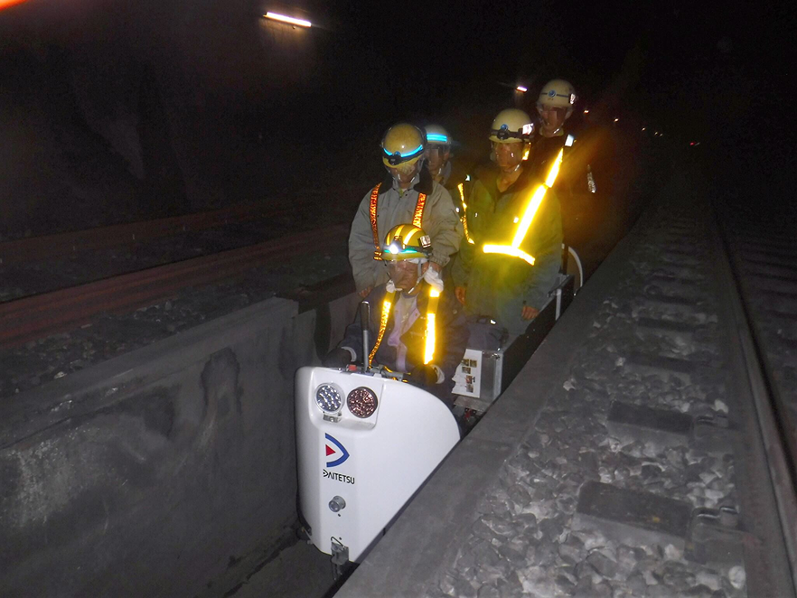 数キロに亘る新幹線トンネル内の人員移動および資器材の運搬を効率化するため、幅が狭い専用通路を走行可能であり、前後に運転席を設けた「新幹線通路用走行台車」を開発しました。