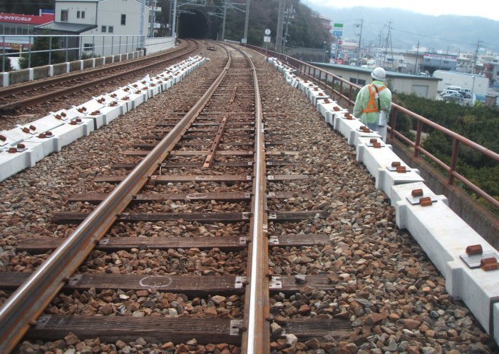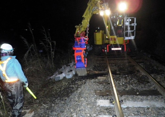 輸送量の少ないローカル線では旧来の木まくらぎによる区間が多く残存していますが、安全面や乗り心地の向上、また将来的なメンテナンス省力化を目的として、強度や耐久面で優位なPCまくらぎへの交換を進めています。 当社では当初より軌陸バックホウを用いた機械施工を行い、施工方法のさらなる改良を図ることで、今では一晩あたり80~100本の交換を実現しています。平成20年頃より毎年約5万本の交換を施工しており、地方交通の安定輸送の確保に貢献しています。