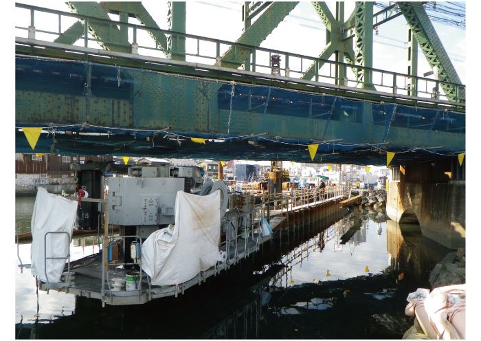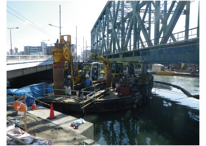本工事は、JR環状線弁天町・大正間の岩崎運河橋りょうと尻無川の交差部にある右側既設護岸の耐震補強工事です。河川内での施工ということで、爆弾探査や支障物調査などの事前調査を行ってからさまざまな施工検討を行いました。特に岩崎運河橋りょう下の離隔は2.5mしかなく、潮の満ち引きも影響するため、施工機械や施工時間帯を工夫して施工し、無事に完成を迎えることができました。