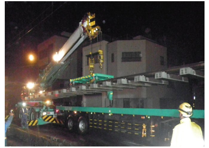 本工事では、海外(特にヨーロッパ)では主流となっている「溝型レール」が採用され、また同時にPCまくらぎ化等の軌道強化を行う工事であったため、基地にて仮組みした軌道を写真のようにトレーラーで運搬しクレーンにより吊上げ、敷設を行いました。