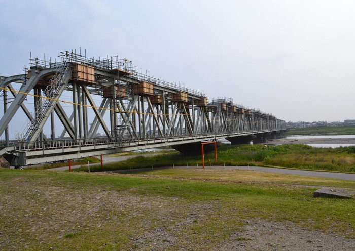 本工事は、北陸本線手取川橋りょうの経年劣化対策を行う工事です。手取川橋りょうは海岸から400m離れた位置にあり、飛来塩分が多いため、桁の塩分濃度を測定しながら修繕を行い、品質確保に努めています。また非常に強い風が吹く場所なので、吊足場の安全管理・施工管理に苦労しています。