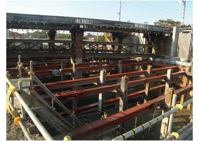 本工事は富山県が計画する主要地方道新湊庄川線の拡幅事業に伴う、道路改修工事です。工事桁と呼ばれる線路仮受桁を設置した後、メッセル工法にて線路下横断掘削を行い、鋼管杭を打設し、線路荷重を仮受けながら、躯体ボックスカルバートの構築を行いました。 線路下工事のため、特に列車への影響に細心の注意を払い施工しました。また工程管理も非常に厳しい現場でありましたが、無事故で完成しました。