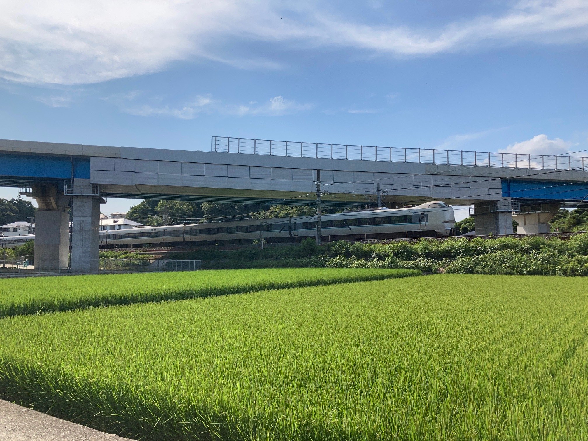 NEXCO 西日本和歌山工事事務所が行う阪和自動車道および湯浅御坊道路の4 車線化事業において、小熊高架橋とJR 紀勢本線(和佐〜道成寺駅間)が交差するこ線橋を新設する工事です。当社の施工区間は小熊高架橋207.5m のうち、町道と線路上を横断する1 径間の橋りょう(約55.5m)であり、桁送出し工法による架設〔鈑桁橋(R=690)〕・送出し総重量 約200t)後に、床版工事・橋りょう点検用の常設足場の設置を行いました。