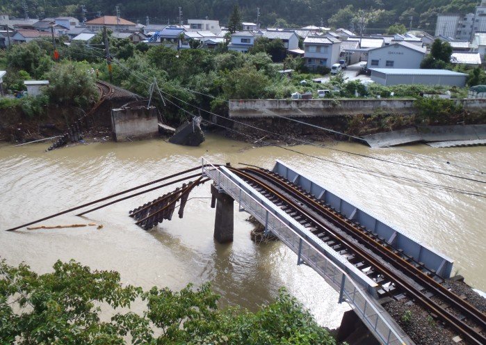 平成23年9月の台風12号による豪雨で流出したJR紀勢本線の那智川橋りょうの復旧工事です。地元住民の強い要望と協力のもと、JR西日本グループ各社が一丸となって早期完成に向けて努力し、災害発生から約3ヶ月後の平成23年12月3日開通にいたりました。