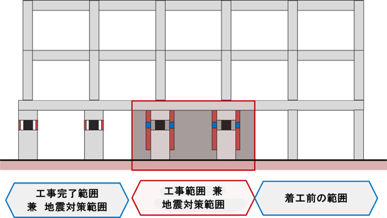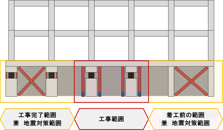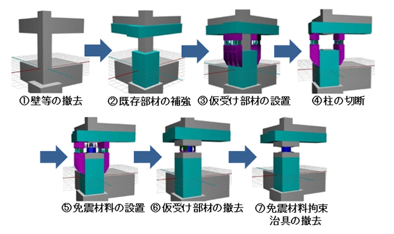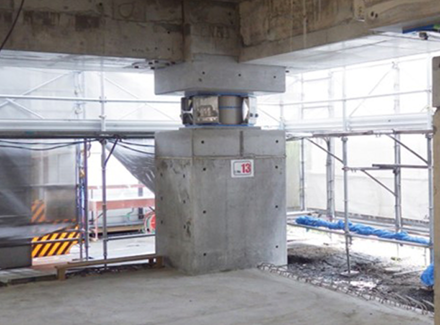 大鉄免震レトロフィット工法は、既存の柱等を切断・撤去して免震装置挿入する際、建物の重量を仮に支える仮受部材を設置することで、工事期間中の建物使用を可能とする工法です。