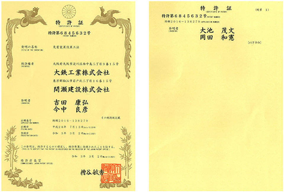大鉄免震レトロフィット工法は免震装置設置方法として、大鉄工業(株)、間瀬建設(株)2社の共同開発で特許を取得しました。