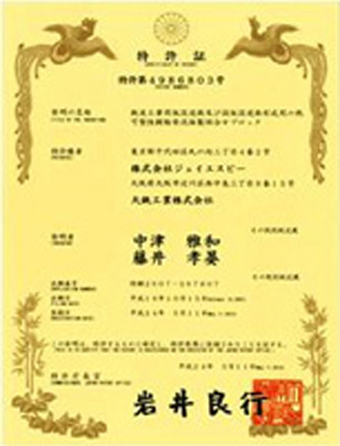 『J-DAIA工法』は、国土交通大臣の指定性能評価機関である一般財団法人日本建築総合試験所の建築技術性能認証委員会の審査に合格し、平成26年1月20日「建築技術性能証明書」を受領しました。併せて3件の特許の出願と商標の登録も行いました。 本性能証明を取得したことによって、『J-DAIA工法』を建築基準法、その他関係法令に基づき適用することが可能となりました。