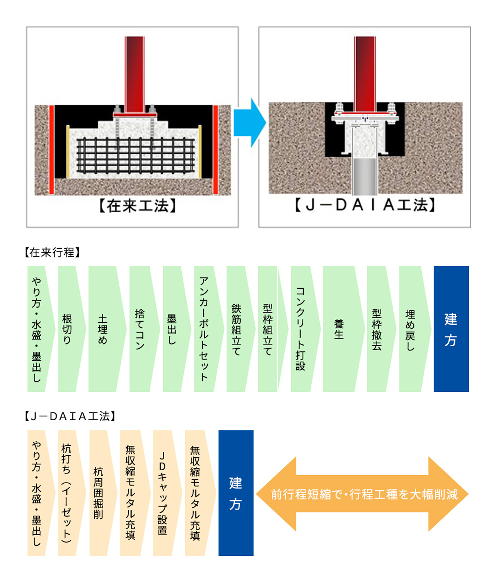 今回開発した『J-DAIA工法』では、一般基礎や基礎梁等を介さずに鋼管杭と鉄骨柱とを直接接合することによって、鉄筋コンクリート基礎を省略することを可能としました。