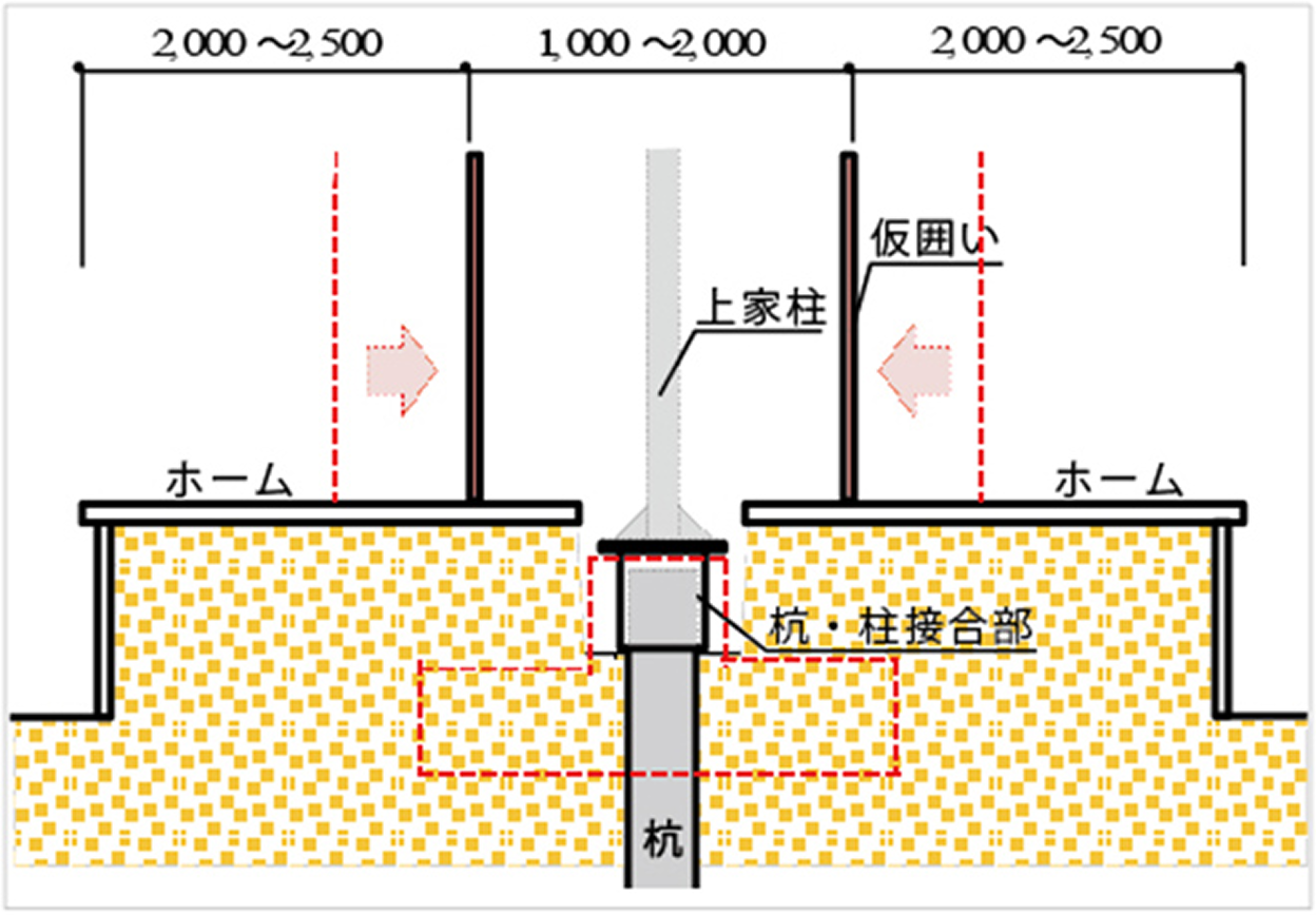 ホーム上の旅客上家を新設するためには、従来の工法では大きなコンクリート基礎が必要となり、工事期間中は、長期にわたりホームが狭くなるなどの問題がありました。