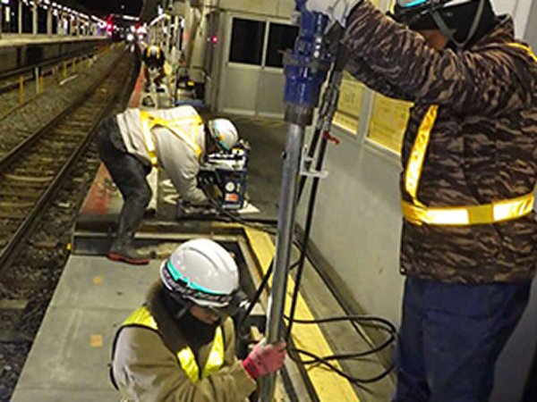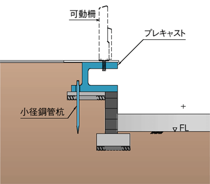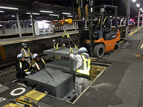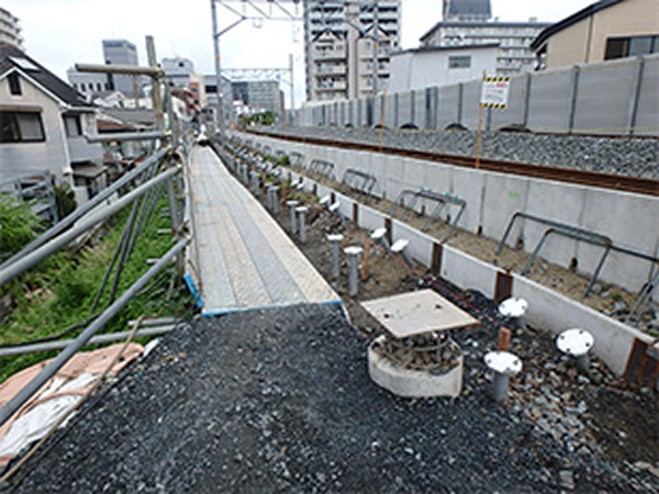 『軽量プレキャストC型ホーム柵基礎工法』は、超高強度繊維補強コンクリート製のC型プレキャスト基礎ブロックと小径鋼管杭を用いた盛土式ホーム柵基礎工法です。軽量のプレキャスト基礎ブロックを用いることでホーム上等で揚重、設置が可能であり、人力で施工可能な小径鋼管杭とで簡易に施工できます。プレキャスト基礎ブロックは、エレベータに積載可能な重量であり、ホーム上を人力で運搬することができます。プレキャストボックス内に電力ケーブル等に配置でき、効果的に設計支持力を得ることができる合理的な基礎構造になっています。従来工法より生産性に優れ、工期及びコストが削減可能です。
