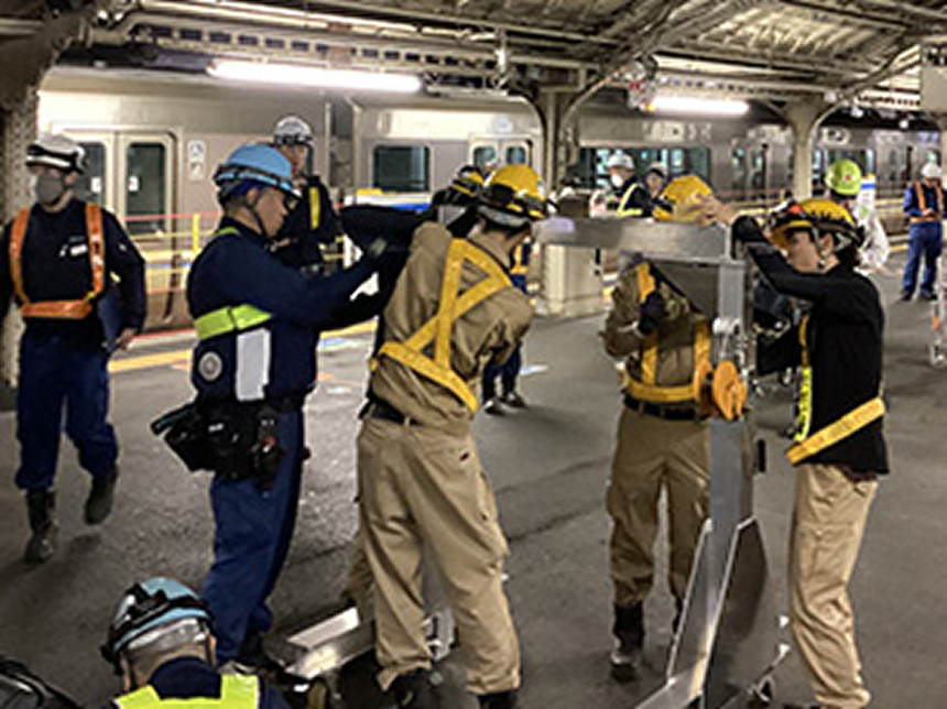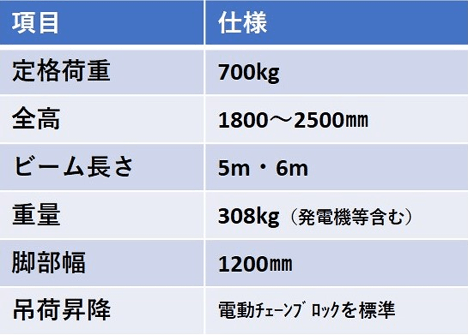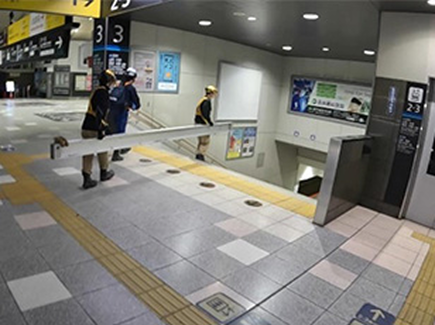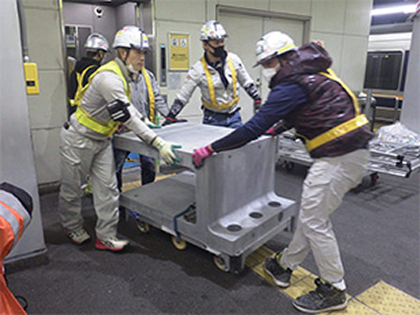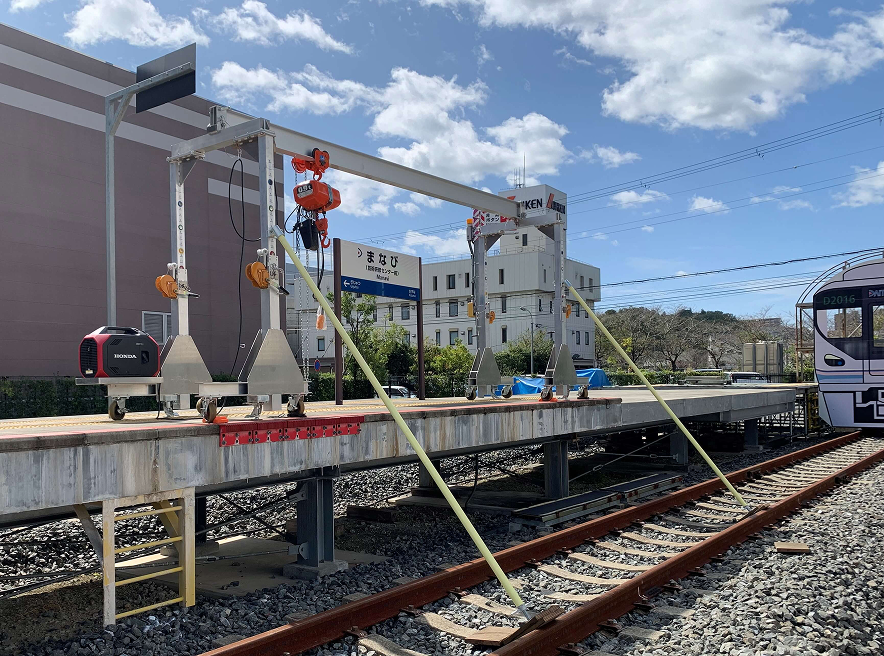 この問題を解決するため、ホーム上で組立可能なアルミ製の門型揚重機を開発しました。部材は軽量で人力にて簡易にホーム上で搬入・組立てることができ、軌陸車の使用が不要となります。組立後重量も約300kgと軽く、ホーム上で使用制限を受けることはありません。当該線の線路閉鎖工事は必要となりますが、軌陸クレーン等を使用するケースと比較して、作業時間、作業日数を確保でき、生産性向上に寄与します。