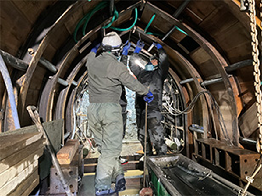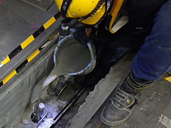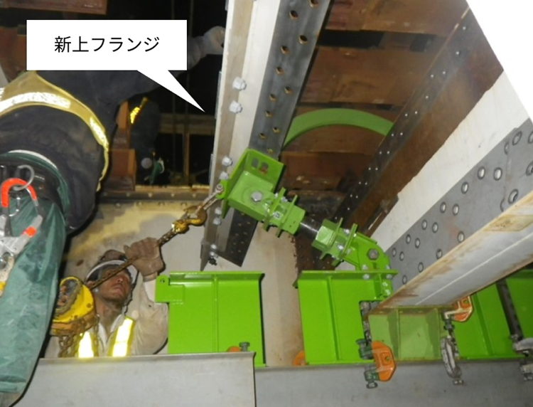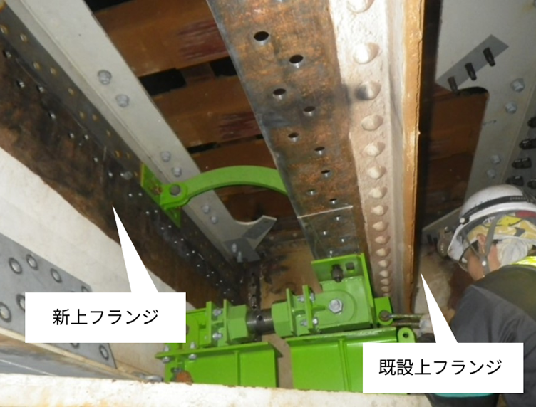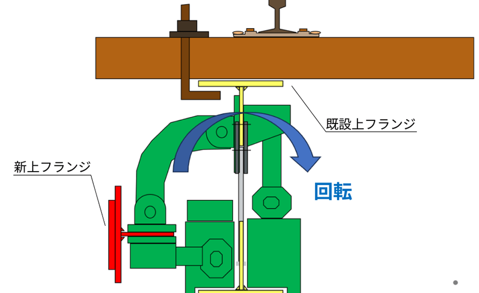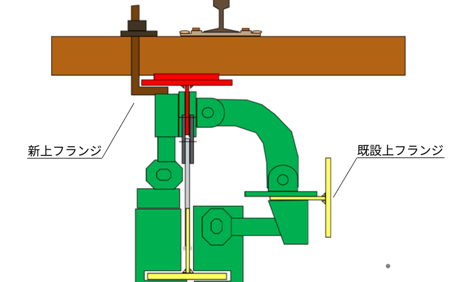 長期間使用した鉄桁では、列車荷重の繰り返し、衝撃により主桁の上フランジの劣化が顕著に現れる場合もあり、この部分の交換が必要となることがあります。これを線路閉鎖工事にて安全かつ効率的に実施するため桁改修工法(主桁上フランジ部回転式取替方式)を開発し、使用しています。