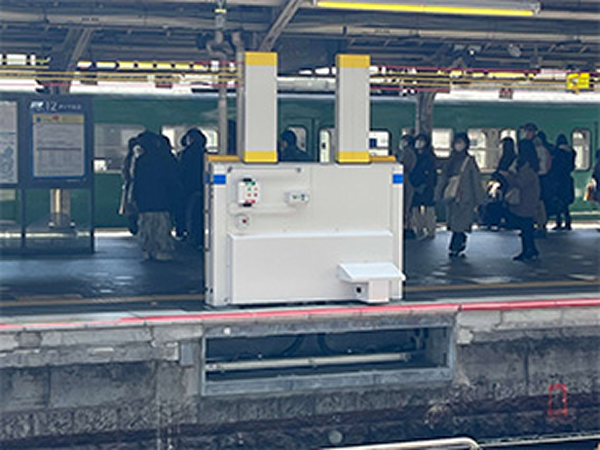 『ホーム上揚重機』は、駅のホームにおける安全性向上を目的としたホーム柵整備工事を安全かつ効率よく施工するための盛土式ホーム柵基礎等を設置する揚重機です。揚重機は、従来軌陸クレーンやフォークリフトを使用して設置していました。軌陸クレーン等では、線路上を走行するために関係線路の線路閉鎖工事が必要であり、このために施工日や施工時間の制限等を大きく受けます。