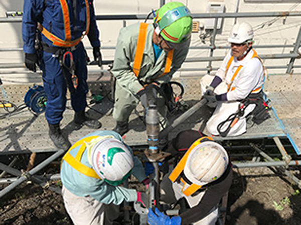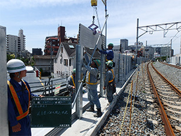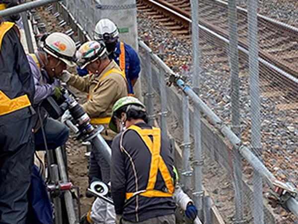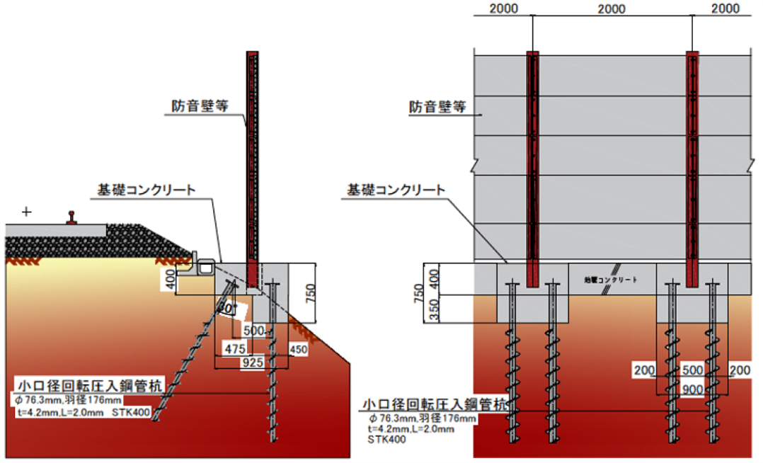 鉄道営業線の盛土部地盤等における防音壁・防風壁の施工は、線路に近接する狭隘な施工環境となることが多くなっています。この基礎工事では、鋼管杭等を採用し線路閉鎖工事により重機を使用して施工する必要があり、安全面や生産性の問題を抱えています。そこで、電動工具を用いた人力で施工が可能な小口径回転圧入鋼管杭を用いた基礎工法を開発しました。小口径回転杭の(斜)組杭による簡易な基礎構造であり、高い水平抵抗力が得られ、狭隘な場所でも安全かつ効率的な施工が可能です。